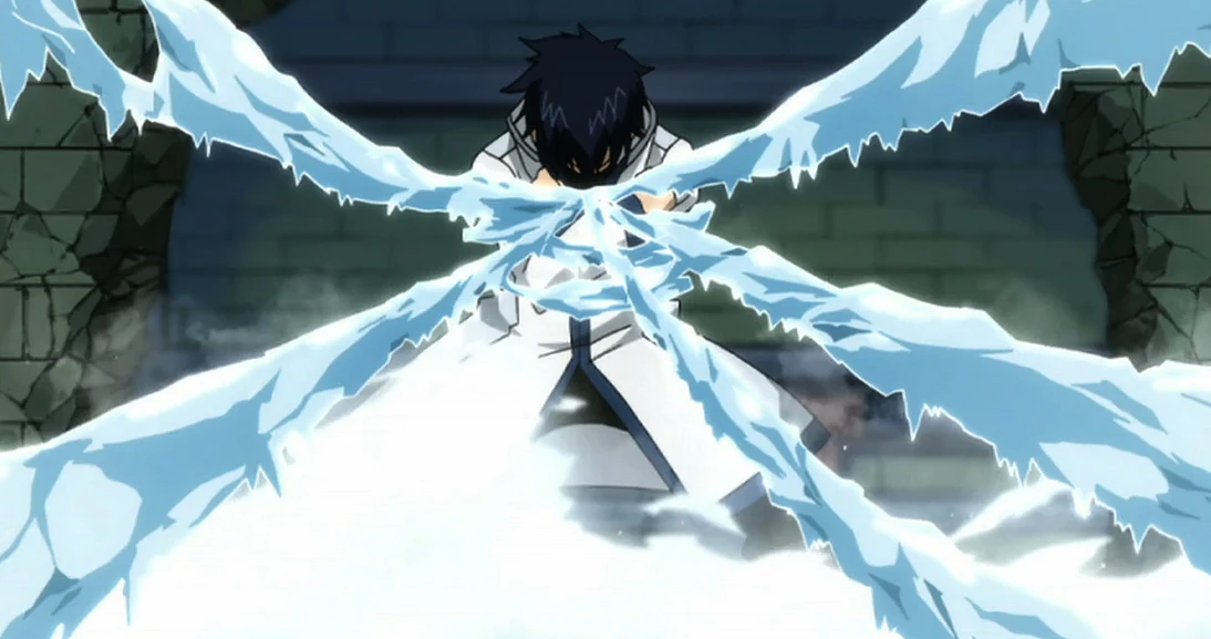 Lodowe Tworzenie: Tarcza (シールド Shīrudo): Gray tworzy dużą, lodową tarczę, kształtem mgliście przypominającą kwiat. Zasłania obszar za sobą.
